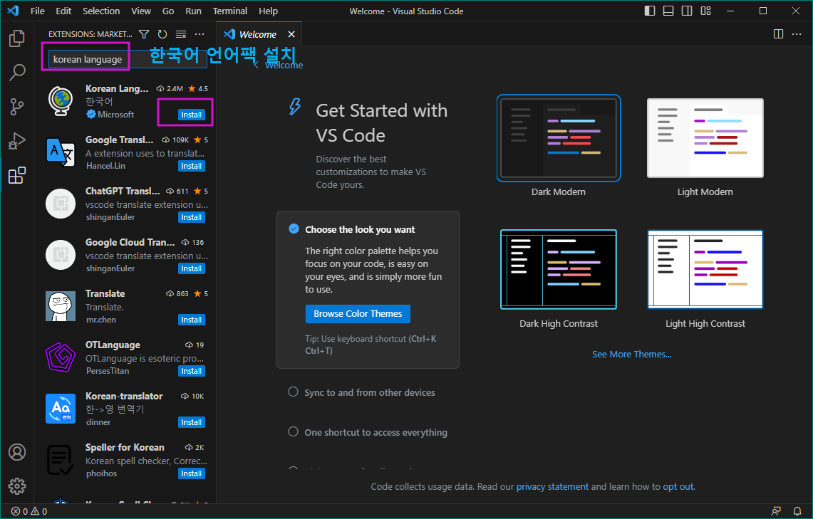 설치가 끝나면 Visual Studio Code 실행을 선택한 상태로 [종료] 버튼을 클릭한다.