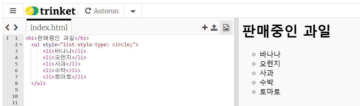 <ul> 태그의 기본 검은 원은 style 속성에 list-style-type 속성값을 삽입해서 작성한다.