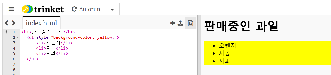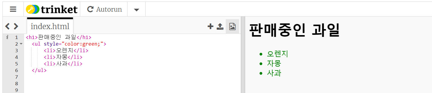 위의 방법처럼 스타일 태그에 지정하여 변경할 수 있지만 아래의 코드처럼 ul 태그에 직접적으로 지정할 수 있다.