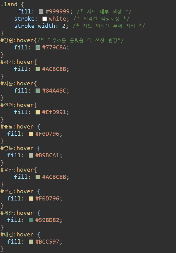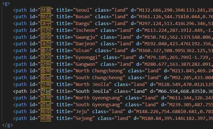 CSS 작업을 위해 <Path id>를 전부 지역 명으로 변경하였다