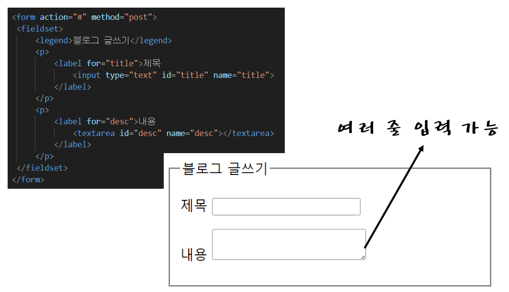 여러 줄의 입력 요소를 생성할 때는 input 태그가 아닌 textarea 태그를 사용한다.