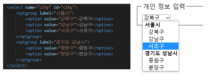 option 태그는 서버에 전송할 값을 value 속성으로 지정할 수 있는데 속성을 생략하면 option 태그의 콘텐츠로 적은 테스트가 값으로 전송되며 optgroup 태그로 항목들을 그룹 지을 때 반드시 label 속성으로 그룹명을 지정해야 한다