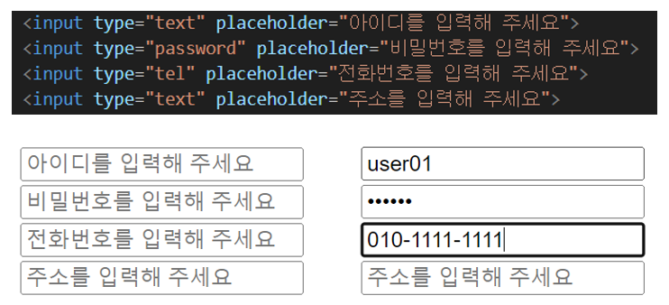 placeholder 속성은 입력 요소에 어떠한 값을 입력하면 되는 지 힌트를 적는 용도로 사용한다.