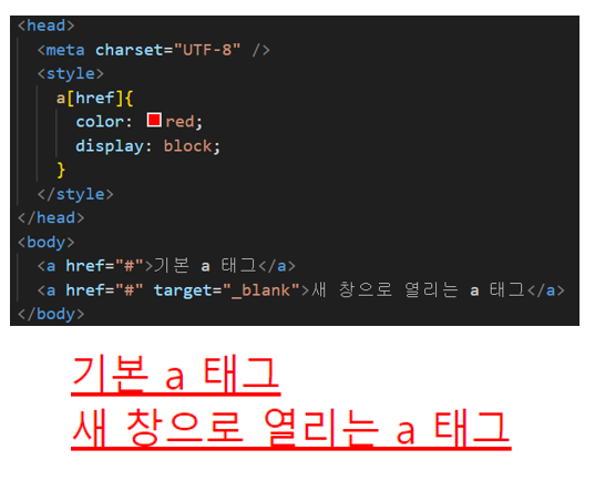위의 코드는 a 태그에 href 속성이 사용된 요소만을 선택해 텍스트 색상을 빨간색으로 지정한다.