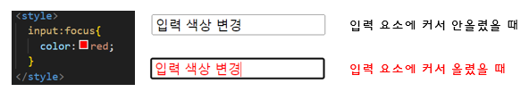 | : f o c u s | 입력 요소에 커서가 활성화되면 선택자로 지정한다. |