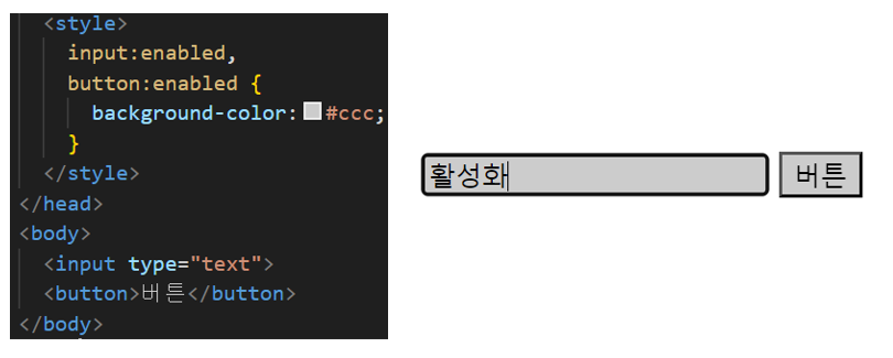 | : e n a b l e d | 상호작용 요소가 활성화되면(disabled 속성이 사용되지 않은 상태면) 선택자로 지정한다. |