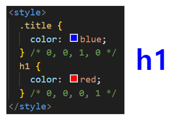 클래스 선택자는 0010(10점), 태그 선택자는 0001(1점)이 되어 점수가 높은 클래스 선택자가 적용되어 파란색이다.
