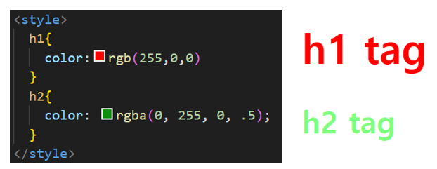 RGB나 RGBA 형식은 RGB값을 256개 숫자(0~255)로 표기한다. 가장 낮은 색 값은 0이고, 높은 색 값은 255다.