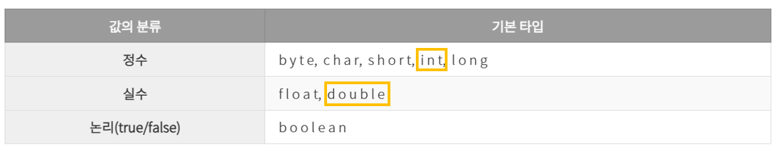 자바는 정수, 실수, 논리값을 저장할 수 있는 기본 타입 8개를 다음과 같이 제공한다.