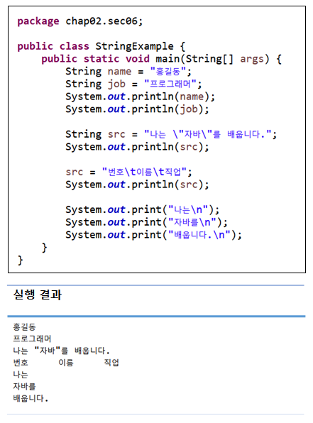 이스케이프 문자를 사용하면 특정 문자를 포함할 수 있고, 출력에 영향을 미치기도 한다.