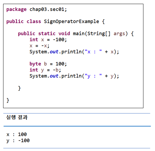 | ※ 주의할점 ! 정수 타입(byte, short, int) 연산의 결과는 int 타입이다. 부호를 변경하는 것도 연산이므로 int 타입 변수에 대입해야한다. |