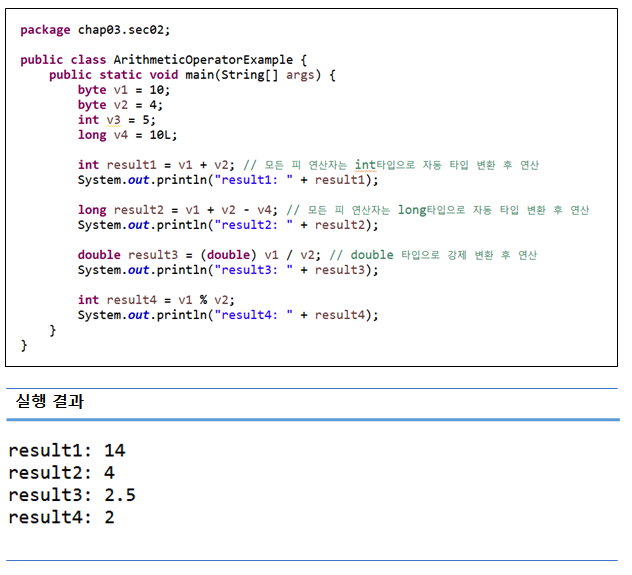 - 피연산자가 정수 타입(byte, short, char, int)이면 연산의 결과는 int 타입이다.