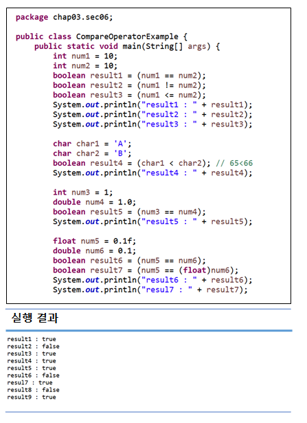비교 연산자는 동등(==, !=) 또는 크기(<, <=, >, >=) 를 평가해서 boolean 타입인 true/false를 산출한다.