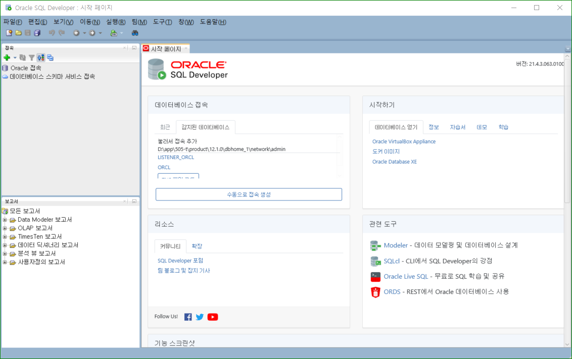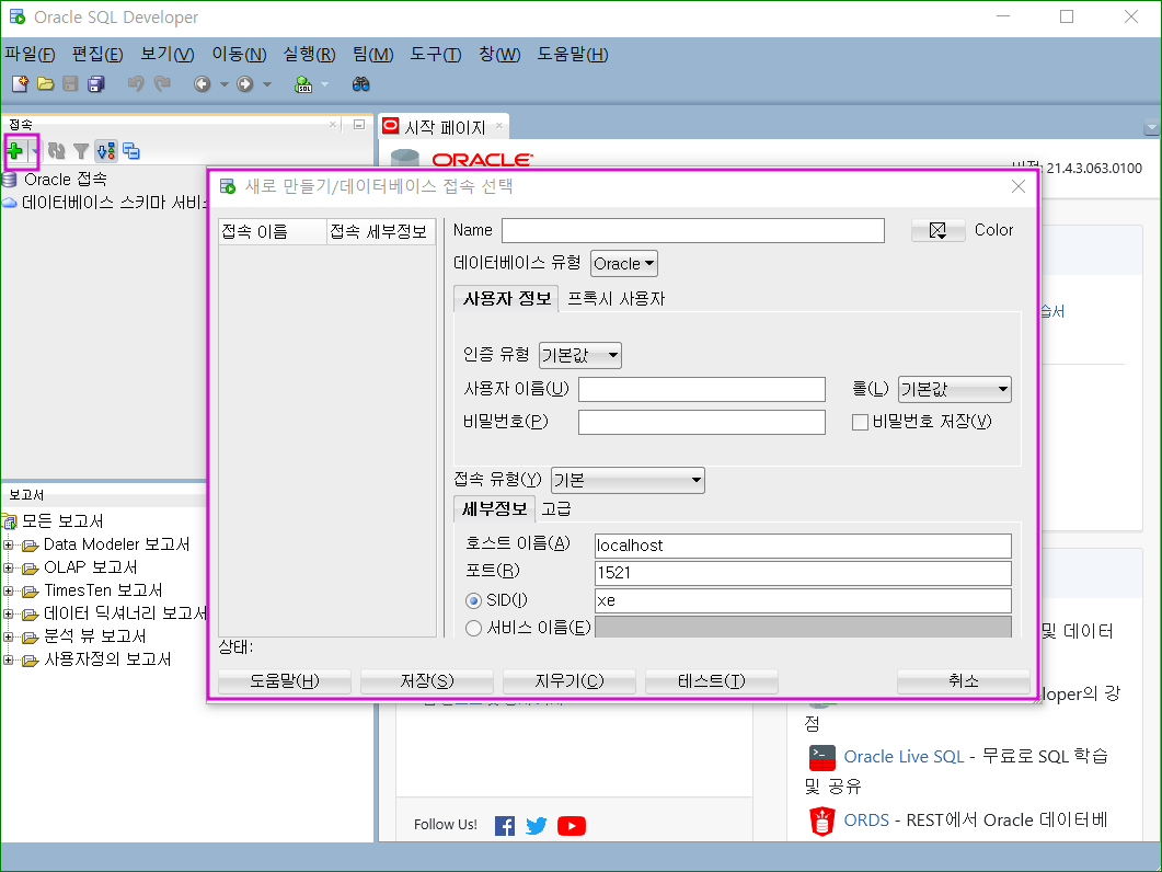 설치 및 설정 [Oracle] SQL Developer 설치 및 설정 Oli-Viaaaa 2023. 6. 6. 12:35 SQL Developer 설치 운영체제에 적합한 버전 다운로드 라이선스 동의 및 파일 내려받기 압축 해제 후 sqldeveloper 파일 실행 시작 페이지 새로만들기 System 생성