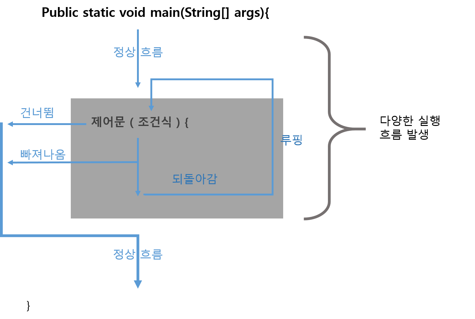 이러한 실행 흐름을 개발자가 원하는 방향으로 바꿀수 있도록 해주는것을 흐름 제어문이하고 한다.