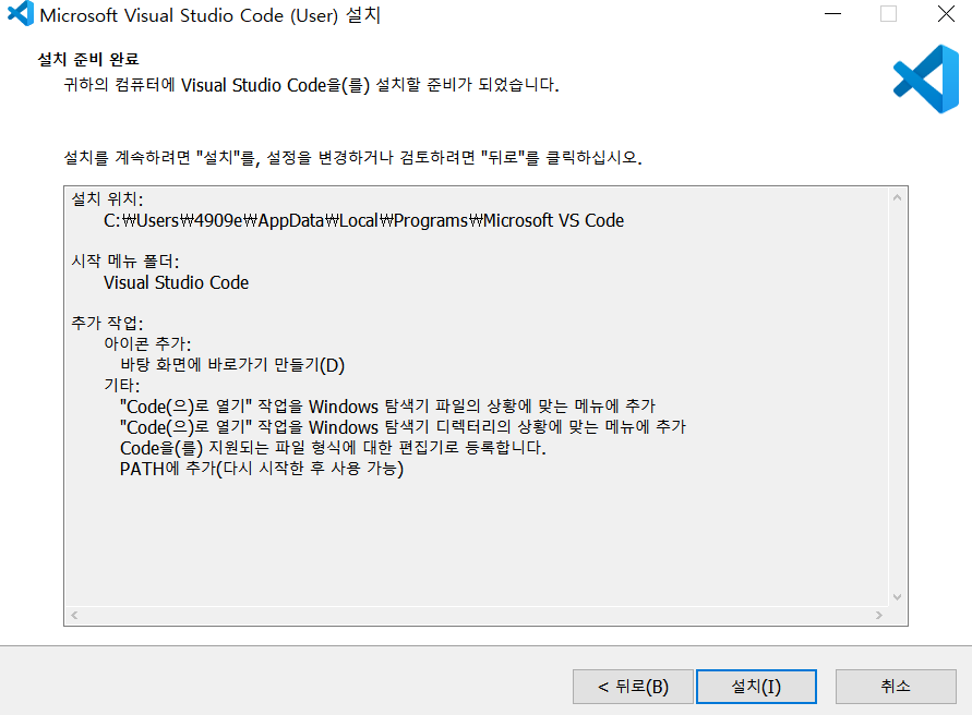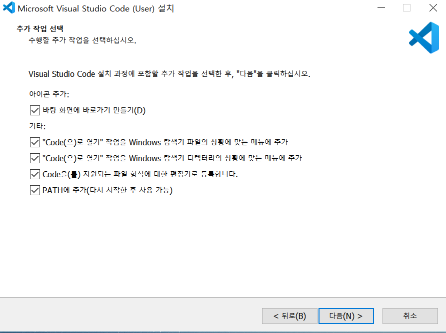 추가 작업을 선택하는 화면이 보이면 위의 이미지 처럼 모든 체크 박스를 선택한 후 [다음]을 클릭한다.