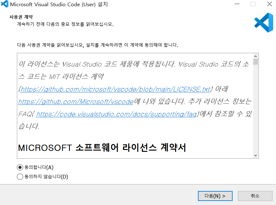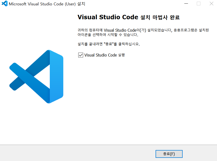 설치가 끝나면 Visual Studio Code 실행을 선택한 상태로 [종료] 버튼을 클릭한다.