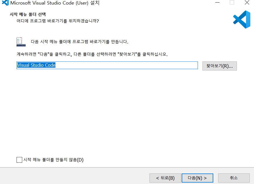 시작 메뉴 폴더를 선택하는 화면이 보이는데 변경할 내용이 없으므로 [다음] 버튼을 클릭한다