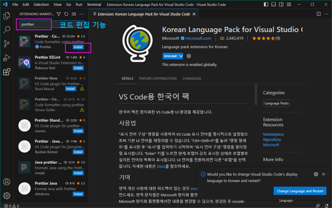 - 자바 스크립트 코드의 실행을 VSCode 내부에서 할 수 있게 지원한다. 자바 스크립트를 공부할 때 유용하다.