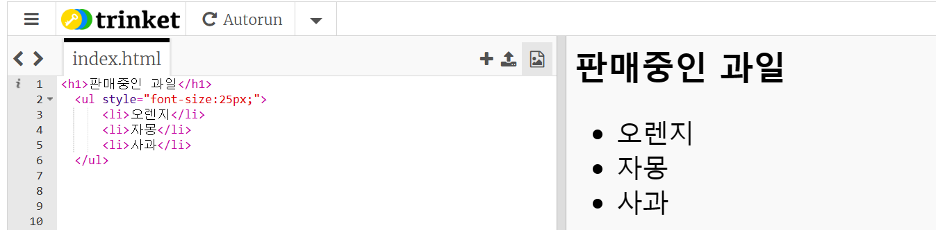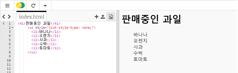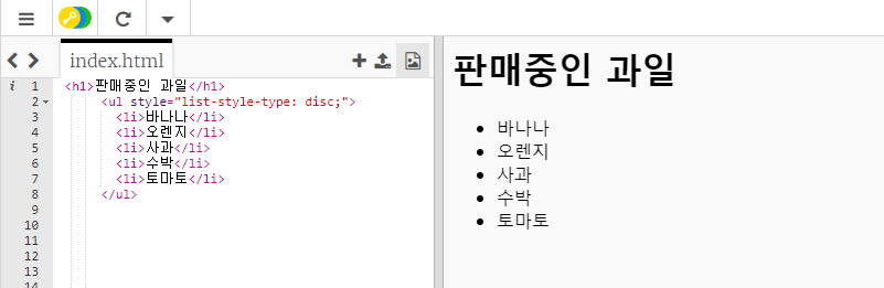 위의 방법처럼 스타일 태그에 지정하여 변경할 수 있지만 아래의 코드처럼 ul 태그에 직접적으로 지정할 수 있다.