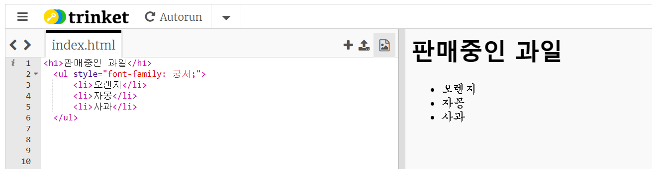 font-family: "궁서;" // 글꼴을 궁서로 변경한다.