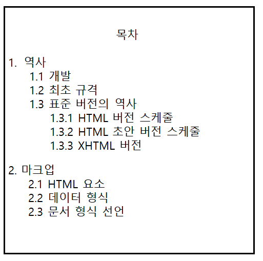 문제 3. 태그를 적절히 사용하여 아래의 이미지와 같은 위키백과 사이트의 목차를 HTML 코드로 작성해보시오