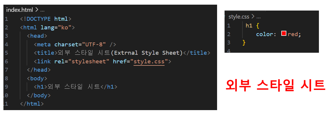 외부 스타일 시트(external style sheet)는 CSS 코드를 작성하는 별도 파일을 만들어 HTML 문서와 CSS를 연결하는 방법이다.