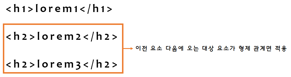앞에서 지정한 선택자 요소 바로 다음에 있는 형제 관계 요소를 선택자로 지정한다.
