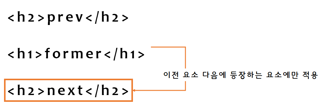 위의 코드로 예시를 들면 h1 태그와 인접한 h2 태그는 next로 이전 요소에 등장한 prev에는 해당사항이 없다