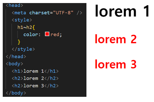 위의 코드는 h1 태그의 형제 관계에 있는 모든 요소를 선택자로 지정한다.