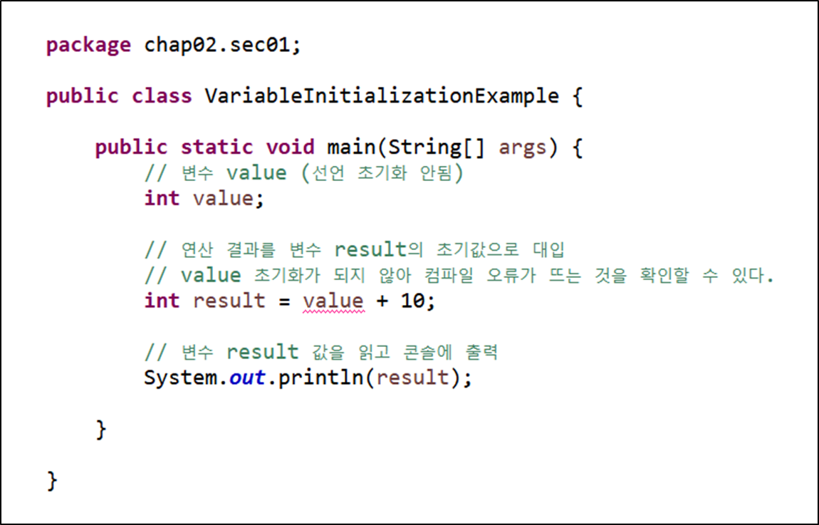 아래의 예제는 초기화되지 않은 변수를 연산식에 사용할 경우 컴파일 에러가 발생하는 것을 보여준다.