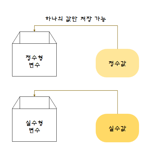 정수형 변수에는 정수값만, 실수형 변수에는 실수값만 저장이 가능하다.