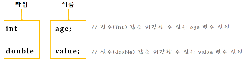 변수 선언은 어떤 타입의 데이터를 저장할 것인지 그리고 변수 이름은 무엇인지를 결정한다.