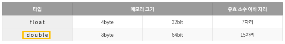 실수 타입에는 float과 double이 있으며 다음과 같이 메모리 할당 크기과 저장되는 값의 범위를 가지고 있다.