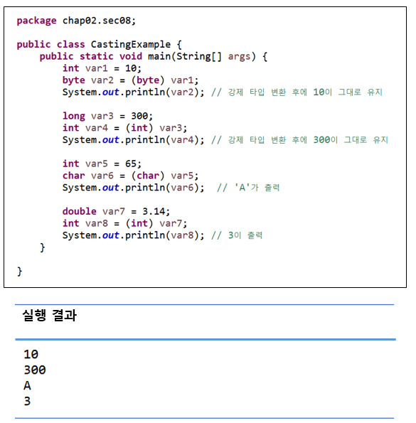 따라서 long 타입은 int 타입으로 자동변환되지 않고, (int)캐스팅을 해서 강제 변환시켜야 한다.