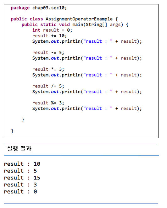 | 변수 | |= | 피연산자 | 우측의 피연산자의 값과 변수의 값을 | 연산 후 결과를 변수에 저장 (변수 = 변수 | 피연산자) |