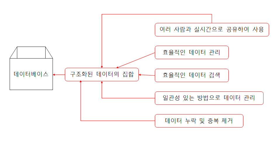 데이터베이스를 통한 데이터 관리란 여러 목적으로 사용할 데이터의 접근 · 관리 등의 업무를 DBMS가 전담하는 방식을 말한다.